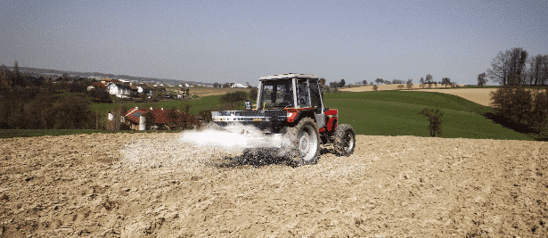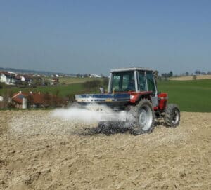 Vlhčená vápencová múka sa nakladá nakladačom do rozmetadla a je aplikovaná na pole. Šírka rozmetania zvyčajne 12-15 m v závislosti od typu rozmetadla.