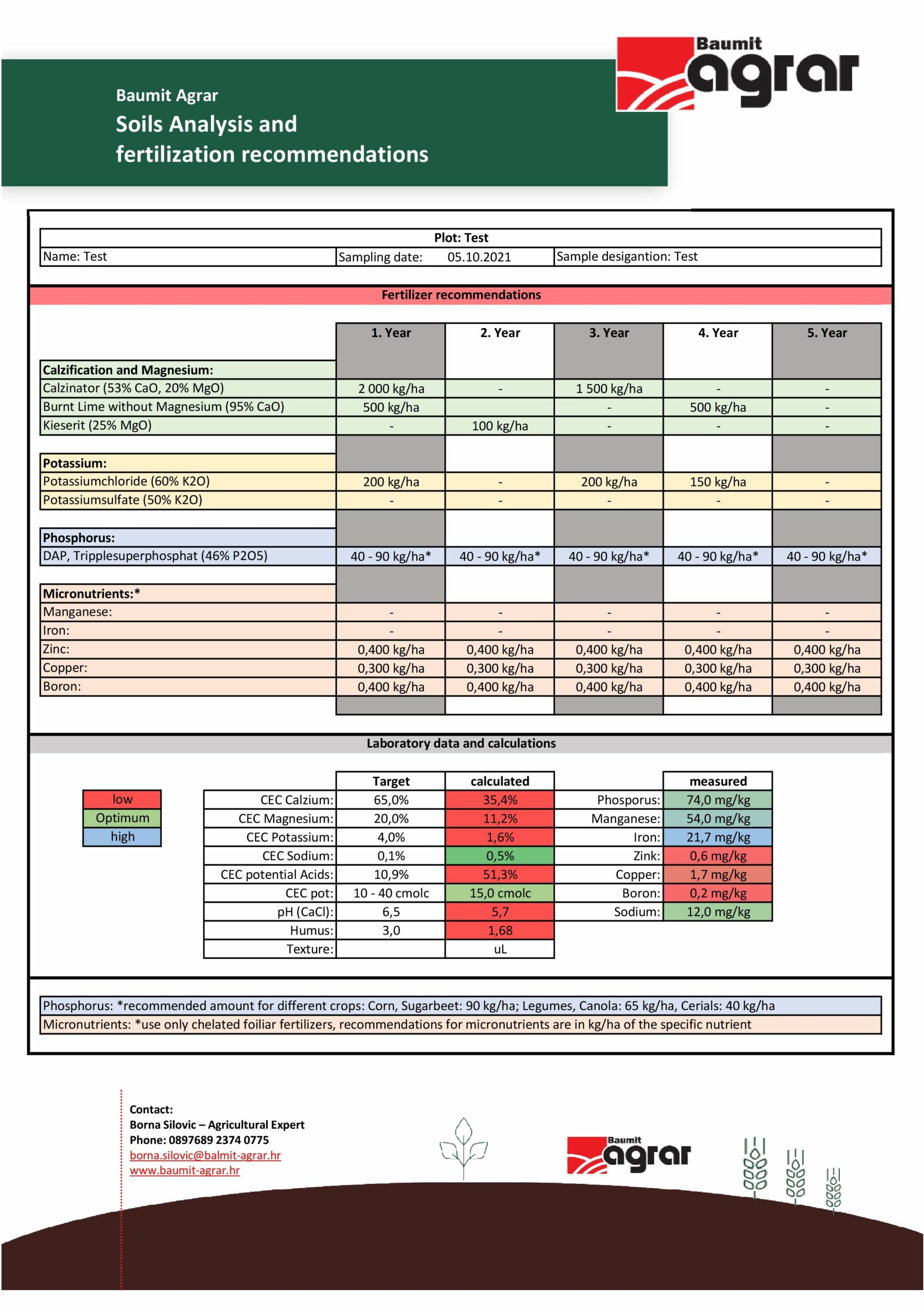 Pre konkrétny prípad odporučíme spôsob vápnenia, výber vhodného druhu vápna, množstva, a termínu aplikácie. Zároveň odporučíme a vysvetlíme, prečo použiť konkrétny druh hnojiva.